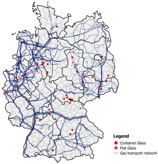 Figure 6 illustrates the locations of production sites for container glass (dark red) and flat glass (light red). Ten of the eleven flat-glass production sites are located close to the gas transportation network and only one is located further away and, hence, supplied by the gas distribution network. A total of 28 container-glass production sites are included in the analysis and about 12 of them are located at a distance from the gas transportation network, grouping the 5 production sites in Thuringia together as one. Consequently, these 12 container-glass production sites (43%) are supplied by the gas distribution network.