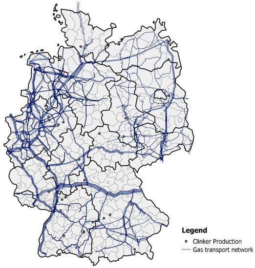 Cement production sites including clinker production in combination with the current gas transportation network. Based on [,] and updated from [].