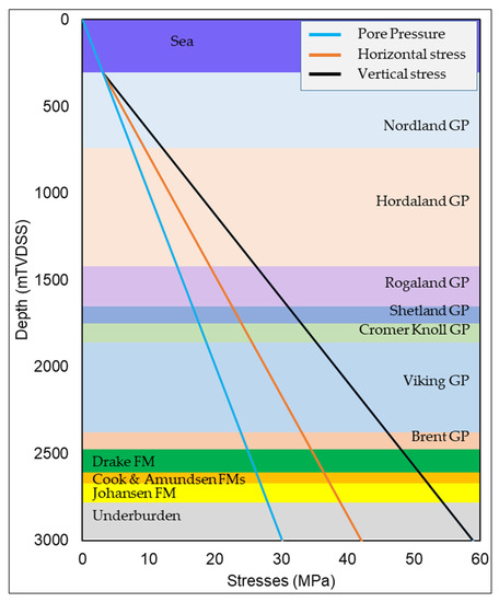 Leak off test data in the study area and Gassnova report [48] reveal that the horizontal stress gradient is lower than the vertical stress, which indicates a normal faulting regime (Figure 3). We assume isotropic horizontal stress conditions to make our model simple. The hydrostatic and overburden pressure gradients are calculated using the density logs from the well 31/5-7. The water depth at the well location is 307 m. The horizontal stress gradient is estimated using the leak off test data scouted from the Gassnova report [48]. From the report, the base case minimum horizontal stress profile is defined based on the lower bound of the majority of the LOTs, which is adapted as the minimum horizontal stress in this study.
