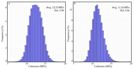 Seismic inverted cohesion property distribution in upper Drake unit (a) and lower Drake unit (b). The average and standard deviation estimated from these distributions are used as the input parameters for the model.