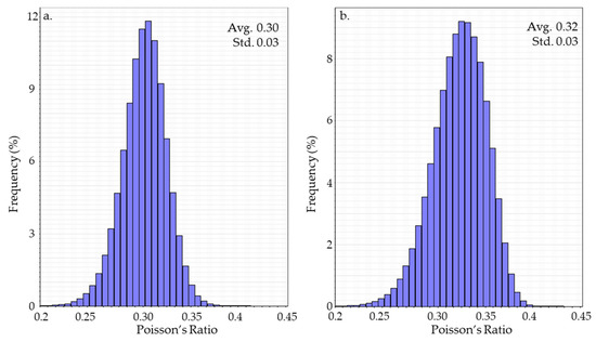 Poisson’s ratio property estimated using inverted impedance volume is distributed in the upper (a) and lower (b) Drake unit. The standard deviation and average values for each unit are also shown.