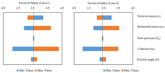 The OVAT (one variable at a time) technique [60,61] was used to estimate the deterministic sensitivity by alternatively assigning minimum and maximum values in each input parameter when other parameters remain in their mean values. Usually, the output is illustrated as a tornado diagram, where the relative influence of each parameter can be assessed. The sensitivity output from this study is shown in Figure 7, where the cohesion (S0) has the most significant impact on the factor of safety in both upper and lower Drake units. In situ stresses (i.e., vertical and horizontal) also have considerable influence. Pore pressure itself has a negligible impact. A similar parameter impact trend was observed between upper (Case-1) and lower (Case-2) Drake units. Only the initial stress-state condition scenarios (Case-1 and -2) are presented here as an example.