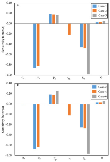 The sensitivity factors of each case are illustrated in Figure 8. The effect of the vertical stress (σv) in all cases is close to zero. Pore pressure (Pp) and friction angle (ϕ) show a direct relation with the reliability value, while horizontal stress (σh), horizontal stress path (γh), and cohesion (S0) are indicated as an inverse relation. The maximum influences during the in situ stress-state condition (Case-1 and -2) and after-injection scenarios (Case-3 and -4) in both upper and lower Drake units are represented by σh and S0, while a significant negative relation is observed between S0 and theoretical failure structural reliability (Case-5 and -6). In addition, overall, the variation between the upper and lower Drake units is negligible.