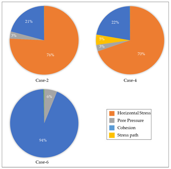 The input parameter contribution to the reliability function is represented by the square of the sensitivity factor (α2), where the sum of all the parameters is equal to 1 [63]. Because of the similar trend between the upper and lower Drake units, only the lower Drake unit (the primary caprock in the Aurora site) model contributions are illustrated in Figure 9. The probabilistic failure values of Case-2 and -4, which are estimated using the FORM technique, mainly depend on the horizontal stress, 76% and 70%, respectively. A substantial influence from cohesion is also observed. However, the cohesion strength property is controlled in the theoretical failure scenario (Case-6) by a 94% impact on overall structural failure.