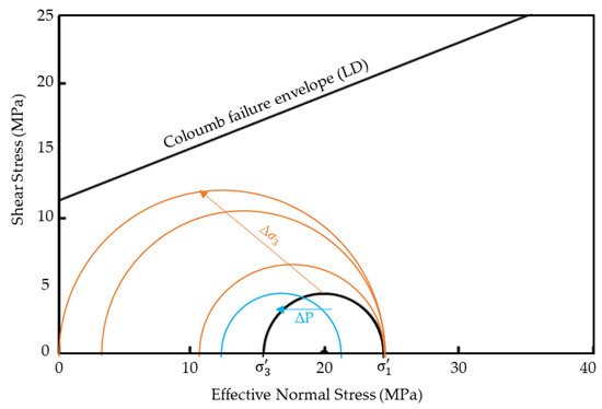 Mohr–Coulomb plot of lower Drake (LD) unit in initial state stress condition (black). Examples of Mohr circles’ shift due to pore pressure increase (blue) and decrease (brown) are illustrated for an explanation of failure results.