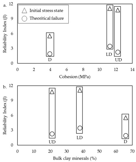 The cross plots illustrated the relation between the reliability index versus cohesion (a), and bulk clay mineralogy (b) of Draupne (D), upper Drake (UD), and lower Drake (LD) shales. The difference between the initial state stress and theoretical failure conditions is also presented. Note that the Draupne shale reliability index and cohesion are adapted from Rahman et al. [40] and the bulk clay mineralogy from Rahman et al. [64].