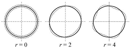 The mode number r = 0 causes uniform radial deformation of the stator along the entire air gap, radial magnetic forces of the second mode number (r = 2) and higher cause bending deformations of the stator, as shown in Figure 1 [20].
