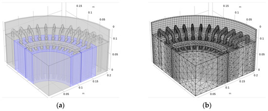 The mesh has the “swept” distribution type at the outer boundary of the model and in the air gap region (Figure 2a). This is necessary for calculations at the boundary between the moving and stationary parts of the model, which describes the processes in the rotor and stator. A special grid was applied manually to the side boundaries of the model sector in order to ensure its symmetry. Thus, continuity conditions act on the side boundaries, which simulate a “full rendering” of the motor geometry. The features of the simulation model of investigated motor are described in more detail in [26].