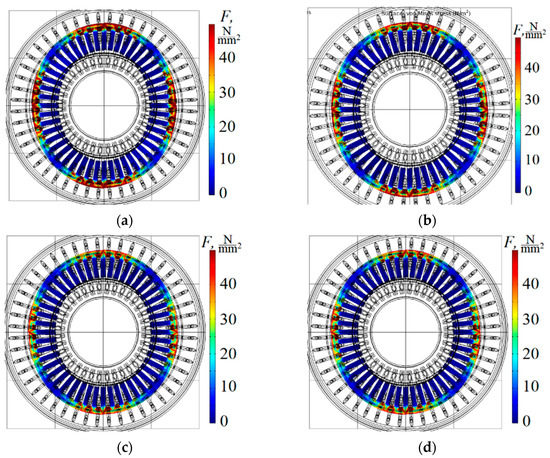 The harmonic composition of the magnetic field waves can be changed in the motor air gap. This may be caused by the supply voltage imbalance. Voltage imbalance studied at the three phase voltages differs only in amplitude. The phase relationship is normal–2π/3. The results of the simulation of stator mechanical stresses in the case of voltage imbalance are shown in Figure 7.
