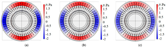 Acoustic radiation pressure of the investigated motor with supply voltage imbalance: (a) IA = IB = IC; (b) IA = 1.1·IB = 0.9·IC; (c) IA = 1.4·IB = 0.8·IC.