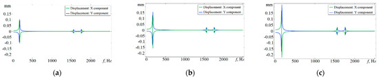 Frequency responses of displacement of the stator of the investigated motor with harmonic distortion of the supply voltage: (a) Ig3 = Ig5 = 0 A; (b) Ig3 = 8.8 A, Ig5 = 3.3 A; (c) Ig3 = 15.4 A, Ig5 = 7.7 A.