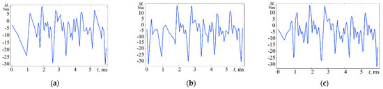 Electromagnetic torque of the investigated motor with harmonic distortion of the supply voltage: (a) Ig3 = Ig5 = 0 A; (b) Ig3 = 8.8 A, Ig5 = 3.3 A; (c) Ig3 = 15.4 A, Ig5 = 7.7 A.