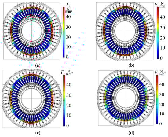 Von Mises stress in the stator core of the investigated motor with harmonic distortion of the supply voltage: (a) Ig3 = Ig5 = 0 A; (b) Ig3 = 8.8 A, Ig5 = 3.3 A; (c) Ig3 = 15.4 A, Ig5 = 7.7 A; (d) Ig3 = 15.4 A, Ig5 = 7.7 A, IA = 1.4·IB = 0.8·IC.