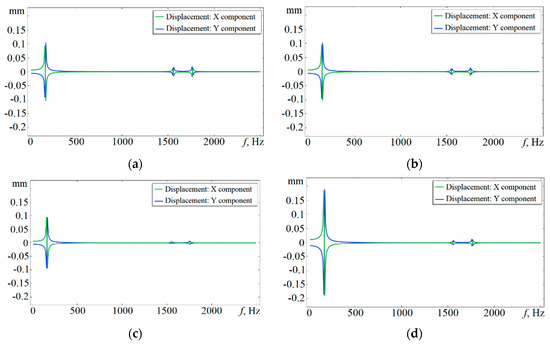 Figure 9 shows the frequency responses of the stator vibration displacements caused by the action of radial magnetic forces in the case of amplitude imbalance of the supply voltage.