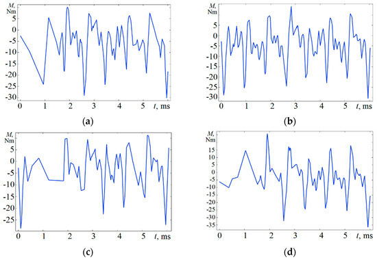 Electromagnetic torque of investigated motor with supply voltage imbalance: (a) IA = IB = IC; (b) IA = 1.1·IB = 0.9·IC; (c) IA = 1.4·IB = 0.8·IC; (d) Ig3 = 15.4 A, Ig5 = 7.7 A, IA = 1.4·IB = 0.8·IC.