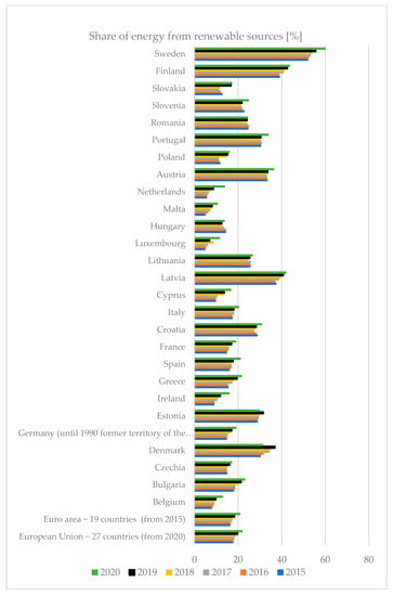 The percentage share of renewable energy in individual EU member-states between 2015 and 2020. Source: Authors’ original compilation based on the Eurostat data [84].