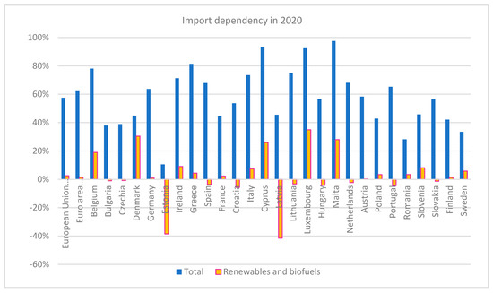 On the one hand, the growing share of renewable energy results from its increasing production. On the other hand, it results from the possibility of importing biofuels. As shown in Figure 2, the degree of energy dependence in individual countries is considerably diversified both in terms of renewable sources and biofuels and in terms of total energy imports.