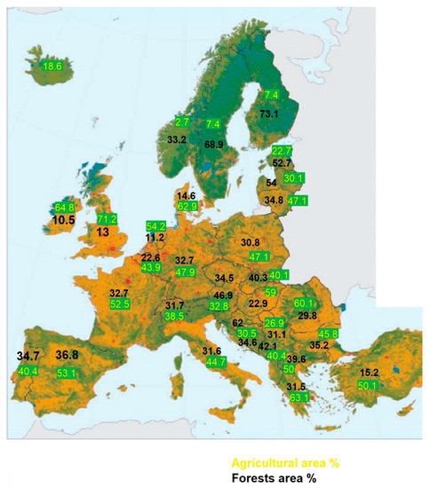 - Agriculture, Forestry and Fishery Statistics—Statistical Books Eurostat; Luxemburg, European Union 2020. Corine cover 2018, European Environment Agency (EFA). Available online: https://ec.europa.eu/eurostat/documents/3217494/12069644/KS-FK-20-001-EN-N.pdf/a7439b01-671b-80ce-85e4-4d803c44340a?t=1608139005821 (accessed on 20 November 2022).