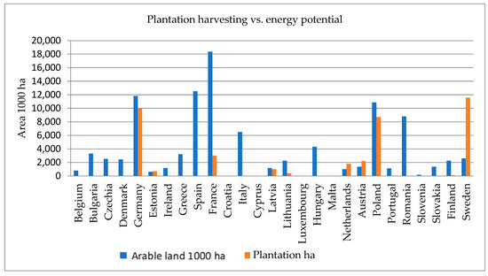 Currently, the use of forest biomass in Europe and individual EU member-states is diversified because there are differences in the availability of forest resources resulting from the real distance from the source of wood harvesting, the available technology, the type of power plant, the national law, and other issues affecting the development of the bioenergy sector [5]. In Finland, the share of biomass in the total energy consumption amounts to 25% (93 TWh) [12]. In Sweden, the total share of energy produced from biomass is 23% (129 TWh), with 49% of energy produced from wood-based fuels [13]. In these cases, wood comes mainly from forest resources, although since the 1980s, Sweden has also had a well-developed system of fast-growing plantations [14,131]. The total forest fuel harvesting potential in the Nordic and Baltic states was estimated at 236 TWh [4]. As results from the latest research indicate, the production of biomass and waste in this area amounts to 313.8 TWh [132], whereas the plant production in the EU-27 is estimated at 485 million tons of dry biomass [133]. Many researchers have stressed the fact that trends in the use of biomass for energy production pose a threat to the resources used for the production of wood and wood materials [134,135,136]. In the near future, a further increase in the demand for biomass is expected. In 2020, the availability of this material was exceeded [137], and it is expected to increase even more by 2030 [131,138,139]. In consequence, there will be a significant deficit of wood. Therefore, the cultivation of energy crops is indicated as the main future direction of securing the growing demand for biomass. It is very likely because the cultivation of such crops is currently subsidized by financial support systems of the EU Common Agricultural Policy. Combining forest biomass resources from forests and plantations will play an important role in the development of energy alternatives. The increase in the available wood potential, including the cultivation of short-rotation energy crops (1–10 years), may result in forest biomass being the main source of energy. However, short-rotation crops are only one of many bioenergy supply options. In the long run, tree species occurring in natural afforested areas with a longer rotation may also secure energy crops. Forest plantations are characterized by different flexibility in the renewal of crop resources, planned harvest flexibility, storage capacity, biomass productivity, and growth rate. The use of these features may be beneficial for the development of a safe and efficient supply of forest bioenergy.
