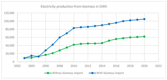 Electricity production from biomass in GWh. Source: Authors’ original compilation based on the Eurostat data [108,156].