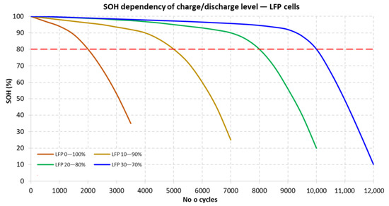 Figure 1 shows the capacity characteristics for the WB-LYP160Ah cells as a function of the number of cycles for the adopted operating ranges of 0–100%, 10–90%, 20–80%, and 30–70% [