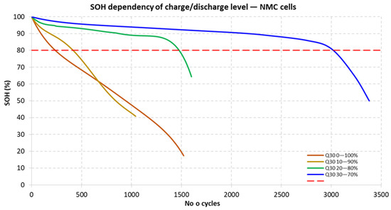 Figure 2 shows the capacity characteristics for INR18650-30Q cells as a function of the number of cycles for the adopted operating ranges of 0–100%, 10–90%, 20–80%, and 30–70%.