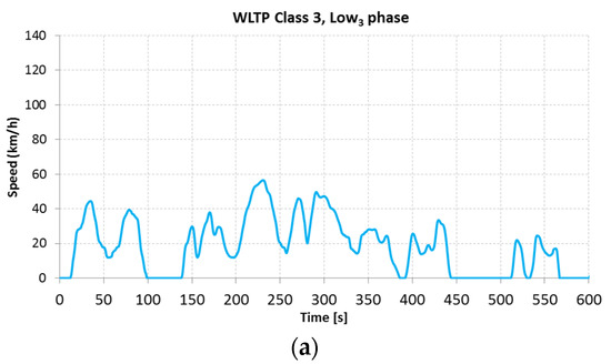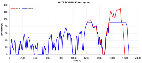Figure 18 shows the results for the modified WLTP-90 test cycle, for a vehicle with a design speed limited to 90 km/h, with a duration of 1861 s. In turn,