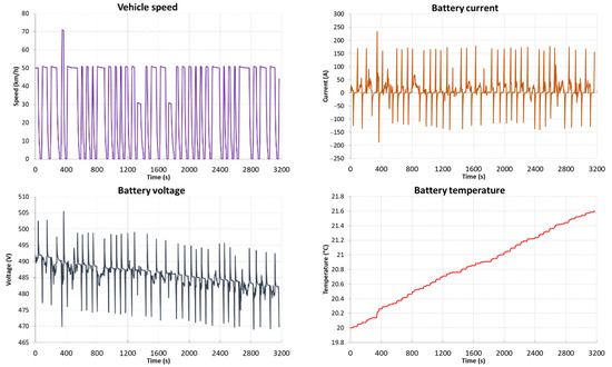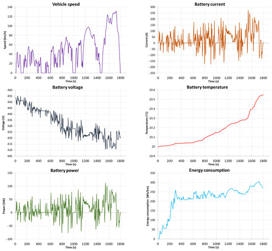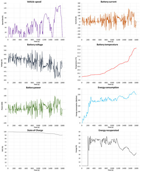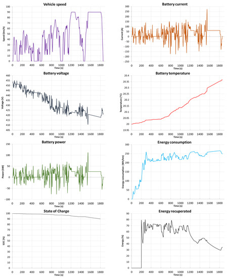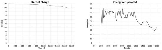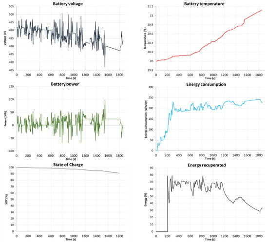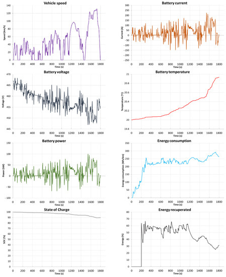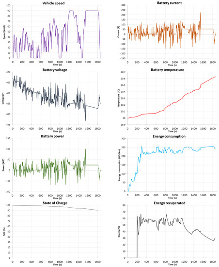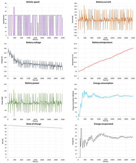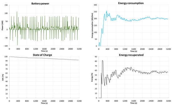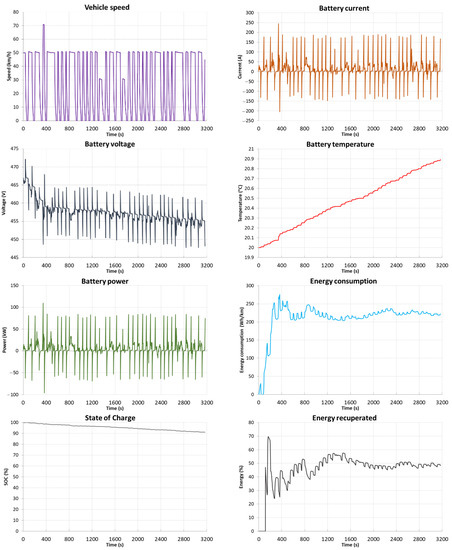 Figure 15), the range of the vehicle is 278.9 km with an average energy consumption of 241.9 Wh/km. Energy consumption in this driving profile is 5.62 kWh and recovery is 1.70 kWh (30%). The temperature of the batteries during the test cycle increased by 1.62 °C, 0.35 °C in the last phase of the test.