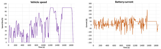 Figure 13), a range of 279.4 km was achieved with an energy consumption of 223.6 W/km. The energy storage during tests in this profile of use is evenly loaded with the current due to the relatively low speed, frequent braking, and acceleration, which allows for a relatively high energy recovery of 56.3%. The operating temperature of the batteries increased by 0.9 °C over the entire test cycle in a linear manner.