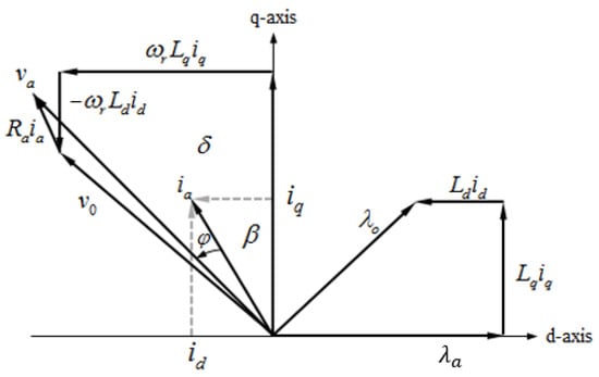 Figure 1 shows the vector diagram of a permanent magnet synchronous motor. In a permanent magnet, the flux linkage in the stator windings occurs along the positive d-axis. The applied current is located in the second quadrant and meets the inductance of the winding to generate d- and q-axis magnetomotive force. The stator magnetomotive force determines the armature flux linkages. As the motor rotates, the flux linkage vector considering the rotational speed is shown in the second quadrant region, which is 90 degrees ahead. The induced voltage caused by the armature flux linkage and the voltage drop of the windings is added to create the phase voltage of the motor. To lower the phase voltage, the induced voltage must be reduced. To lower the induced voltage, the d-axis magnetomotive force must be increased. The d-axis magnetomotive force is a demagnetizing magnetism, which weakens the flux linkage from the permanent magnet to the stator winding.