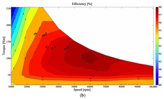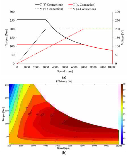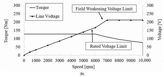 There are three types of motors used to drive electric vehicles: interior permanent magnet synchronous motor (IPMSM), induction motor (IM), and wound field synchronous motor (WFSM). IPMSM has the characteristics of high efficiency and high power density among the other types motors. However, there is a limit to increasing the maximum speed because the magnetic flux cannot be controlled. On the other hand, the wound field synchronous motor can have a wide field-weakening area because it can control the field flux, but it has lower efficiencies compared to the interior permanent magnet synchronous motor due to a loss of copper during field winding [5,6]. IPMSM uses a graded permanent magnet with high residual magnetic flux density to output high torques at the rated point. If a high-grade permanent magnet is used in the same battery, the speed limit point appears at a lower speed due to the high back electromotive force.