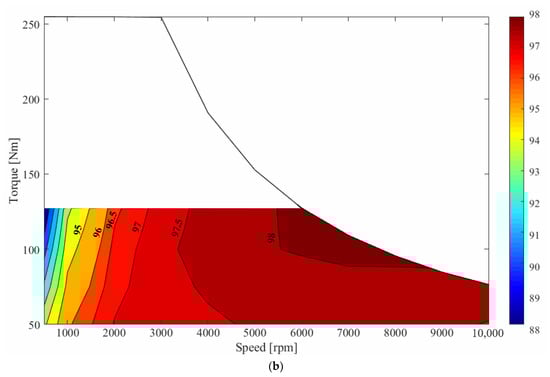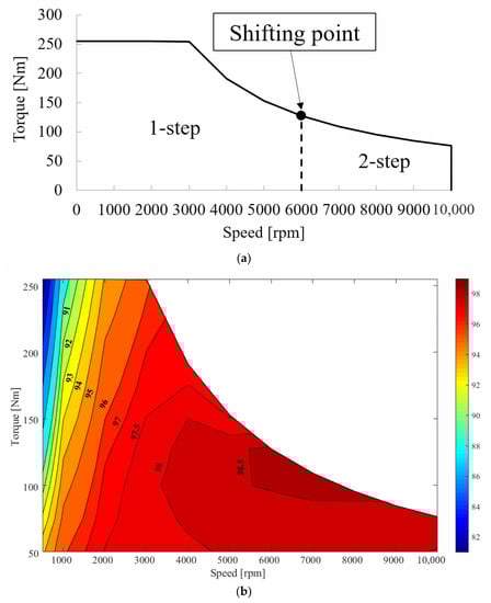 Figure 9. Effect of applying electromagnetic multi-step transmissions. (a) Operating characteristics. (b) Efficiency characteristics.