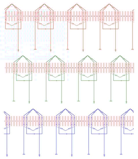 Figure 7 shows the stator winding diagram for each phase. Figure 8 shows the circuit diagram and current flow for electromagnetic multi-step transmissions. Three thyristors are used for changing speeds in a circuit corresponding to one phase. Figure 8a is a circuit diagram before changing the speed, and it operates with two parallel paths. In this case, only one thyristor per phase is used. In the process of changing speed, the thyristor used before changing speed opens, and the remaining two thyristors are shortened to divide the series-connected circuit in parallel. Figure 8b shows the circuit after changing the speed, and it operates with four parallel paths.