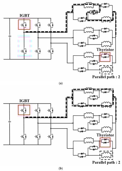 Figure 6 shows the series and parallel structure of the windings before and after electromagnetic multi-step applications. In the low-speed region, it operates with the winding structure as shown in Figure 6a, and in the high-speed region after a change in speed, it operates with the winding structure, as shown in Figure 6b. A switching circuit is used to change the number of parallel paths. The switch element for the change in speed uses a thyristor.