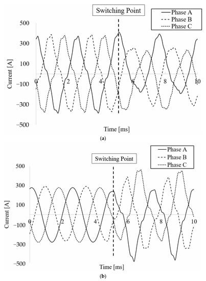 Figure 10 shows the waveform of the current appearing during the change in speed processes, which was analyzed via a simulation. During the change in speed, the inductance changes as the number of parallel paths moving through the switch changes. This causes transients and changes in the magnitude of the current. Before the change in speed, the three phases are the same, but they have the same size; however, after the change in speed, the current waveform appears to be unbalanced.