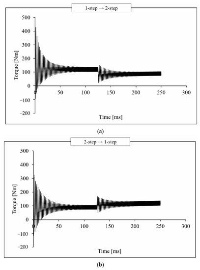 Figure 12. Torque waveform during changing speed. (a) Step 1 to step 2. (b) Step 2 to step 1.