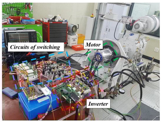 Figure 13 is a configuration diagram for testing the phenomenon that appears during the process of changing speeds. The large configuration consists of a motor and an inverter, and the switching circuit for speed change is arranged, as shown in the Figure 13. Figure 14 shows the speed-changing current waveform process analyzed using a test. As shown in the current waveform, an imbalance occurs in the current waveform instantaneously when a change in speed is performed. A method to solve the imbalance problem is to provide a dead time during the process of changing speeds.