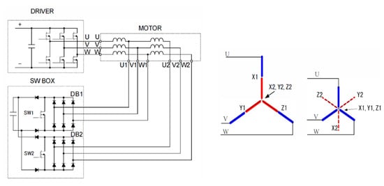 There are studies to secure a large starting torque and a wide field-weakening area for high-speed operations that are required by electric vehicle systems [17]. In the same way as IM’s wye-delta method, it is driven by wye connections in the low-speed range to secure torque to increase acceleration and climbing abilities. The characteristic of the wye connection is that the phase voltage and the line voltage differ by 1.73 times. The characteristic of the delta connection is that the phase voltage and the line voltage are the same. Comparing the back electromotive force at the same speed, in the case of the back electromotive force of the wye connection, two phase back electromotive forces appear as back electromotive forces between the lines, and in the back electromotive force of the delta connection, the back electromotive force corresponding to one phase appears as the back EMF between the lines. Therefore, it is a method for changing to a delta connection in order to satisfy high torques by using high back electromotive force at low speeds and can be used to lower back electromotive forces in high-speed regions [18].
