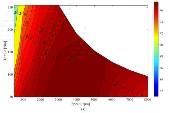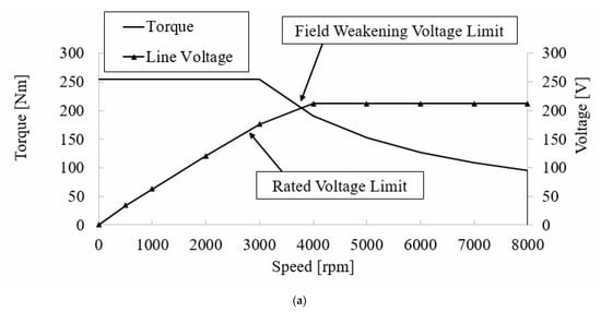 There are three types of motors used to drive electric vehicles: interior permanent magnet synchronous motor (IPMSM), induction motor (IM), and wound field synchronous motor (WFSM). IPMSM has the characteristics of high efficiency and high power density among the other types motors. However, there is a limit to increasing the maximum speed because the magnetic flux cannot be controlled. On the other hand, the wound field synchronous motor can have a wide field-weakening area because it can control the field flux, but it has lower efficiencies compared to the interior permanent magnet synchronous motor due to a loss of copper during field winding [5,6]. IPMSM uses a graded permanent magnet with high residual magnetic flux density to output high torques at the rated point. If a high-grade permanent magnet is used in the same battery, the speed limit point appears at a lower speed due to the high back electromotive force.