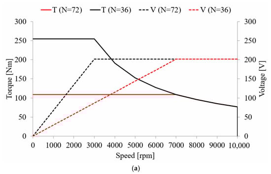 Figure 2 shows the shape of a motor for driving an EV with 8 poles and 48 slots. Table 1 shows the specifications of the 80 (kW) IPMSM. Permanent magnets are arranged in a delta shape to concentrate the magnetic flux. The output is 80 kW, and the maximum torque is 254.65 Nm. Before change in speed, the number of parallel paths is two, and after change in speed, the number of parallel paths is four. Before applying the multi-step transmission, the electromagnetic characteristics of the two models were analyzed to select the change in speed points.