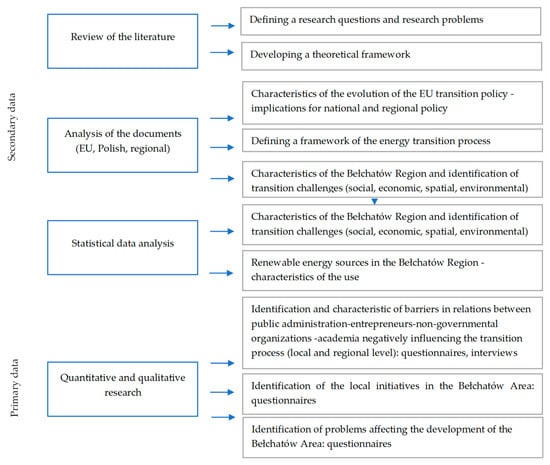 The research methodology used by the author may be considered a model that might potentially be used not only in research on other areas in the process of energy transition but also on the implementation of energy policy, including the concept of governance. The key element of the methodology used here is the variety of research tools (both secondary and primary). Multiple data collections and perspectives allowed for a reduction in the possibility of misinterpretation [17] (p. 640). Triangulation allowed for the combination of various techniques and sources, and thus provided a full description and multifaceted understanding of the case [18] (p. 24). Its application was important from the point of view of several research questions and the use of various methods and sources [19] (p. 25). The methodology used by the author is exploratory (as a result of the research procedure, general questions, and the research thesis being defined), descriptive (the phenomenon was described comprehensively, taking into account the context of its occurrence), and explanatory (focused on the analysis of the causes and effects of existing relations) [20]. The research was rolling, which allowed for the modification and development of its methodology at subsequent stages of the process. A strongly emphasised element of the research process is its iterative nature, allowing the author to return to selected research areas in subsequent phases. The presented research results (collected by the author thanks to the implementation of the process according to these general principles), as well as the conclusions drawn, can contribute to the knowledge of the processes related to the management of the development of areas undergoing transformation, and be a source of inspiration for other researchers.