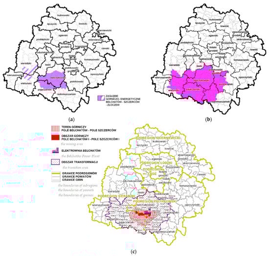 Delimitation of the Bełchatów Area: (a) Mining and energy basin Bełchatów-Szczerców-Złoczew, the Development Strategy of Łódzkie Region 2020 [60] (p. 53); (b) Mining and Energy Transformation Area, the Development Strategy of Łódzkie Region 2030 [2] (p. 103); (c) Mining and energy basin Bełchatów-Szczercow-Zloczew, Territorial Just Transition Plan for Łódzkie Region [73] (p. 6).