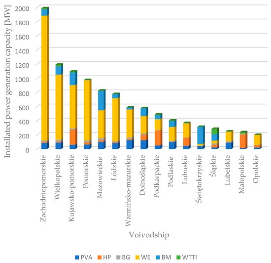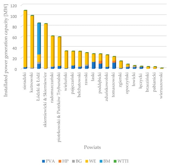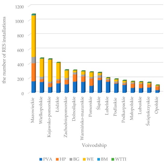 The growth of low-carbon and renewable energy sources in global demand and supply is conspicuous [76], but regional differences show that transformation is challenging not only for individual countries, but also for various stakeholder groups (including certain industries, international and national companies, and consumers) [77]. This is confirmed in particular by the analysis of the installation of renewable energy sources in Poland, in particular in Łódzkie Region, published by the Energy Regulatory Office. The main RES installations in Poland include photovoltaic assemblies (PVA), hydropower (HP), biogas (BG), wind energy (WE), biomass (BM), and thermal waste treatment plants (WTTI). The share of renewable energy sources in the total energy production in Poland in 2020 was at the level of 17.9%, while in Łódzkie Voivodeship it reached a meagre 6%, thus placing the region in the penultimate position in the country. Both the number of installations and their capacity [MW] confirm the negligible share of Łódzkie Region in the Polish renewable energy market. The total capacity of green energy produced in Poland is 10,569 MW, with 777.73 MW in Łódzkie Region (only 7.36% of national production). The 5053 installations in the country in 2021 (among which only 417 were in Łódzkie Voivodeship) were primarily wind and solar energy (Figure 3), the main source of energy production in Poland.