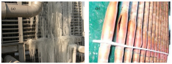 The impacts of cooling tower freezing. (a) Hanging ice at the air inlet. (b) The cracked coils.