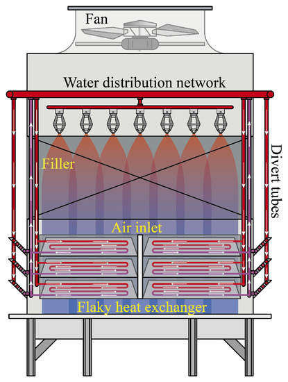 The active and system defrosting techniques in HVAC (Heating, Ventilation, and Air Conditioning) such as electrohydrodynamic, low-frequency oscillation, ultrasonic vibration methods, hot gas reverse cycle, electric heater, desiccant dehumidifiers, and controlling strategies can reduce the ice on the equipment surface [23,24]. Among these methods, the efficiency, COP, and energy consumption of the hot gas reverse cycle are superior to the other methods. Similarly, one way to eliminate the hanging ice is the dry and wet mixing operation: heating the air inlet louvers with hot water. A numerical test was run in MATLAB on an open countercurrent mechanical draft cooling tower. The MATLAB source code can be found in the Supplementary Files. The air inlet louvers of the tower were replaced by flaky heat exchangers, and part of the hot water was diverted into the flaky heat exchangers before entering the nozzles. The water in the heat exchangers kept the surface temperature above the freezing point so that the water droplets splashed on the air inlet would not freeze. The schematic diagram of this method is shown in Figure 2.