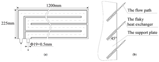 The size of the cooling tower was 2.4 m × 2.4 m and there were four air inlets distributed on the four walls. The airspeed at each air inlet was 4 m/s, and the height of the air inlets was 0.5 m. To reduce the airflow resistance within the heat exchangers, each air inlet was divided into two groups, and each group had 3 pieces of flaky heat exchangers arranged vertically. There were 24 pieces of heat exchangers in total. The diagram of the flaky heat exchanger is shown in Figure 3a. The heat exchangers are made of 0.5 mm stainless steel plates. The cross-section of the flow path is approximately ellipse, with a short axis of 8 mm and a long axis of 44 mm. The flaky heat exchangers were fixed on a support plate with an installation angle of 45, as shown in Figure 3b.