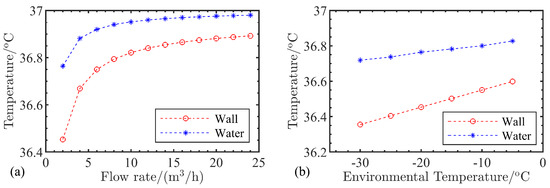 Plots of the temperature of the water and the surface of the wall at the outlet of the heat exchanger. The independent variables in (a,b) are flow rate and environment temperature, respectively.