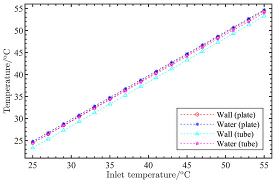 The temperature of the water and the surface of the wall at the outlet of the flaky heat exchangers under a certain inlet temperature (37 C) and environmental temperature (−20 C) were calculated, and the results are shown in Figure 4a. The changes in the water and surface temperature at the outlet of the heat exchanger with the environmental temperature are plotted in Figure 4b. The inlet temperature and flow rate were set to 37 C and 2 m/h, respectively.