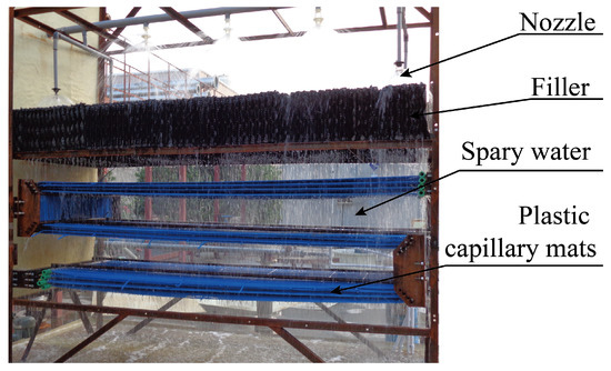 The experimental setup is shown in Figure 6. The results show that the cooling capability of two closed cooling towers with PE capillary mats was approximately equal to a normally closed cooling tower with copper tubes. Furthermore, the unit cost and energy consumption of the two PE-capillary-mats towers and the copper-tubes tower were nearly the same [26]. In summary, it is cost-effective to use small-diameter engineering plastic tubes instead of normal metal tubes in closed cooling towers.