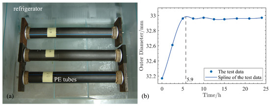 The results show that the tube produced reversible deformation during the freezing test. The diameter of the tubes increased rapidly within the first 5.9 h and then stabilized, and no vitrification of PE was observed. The photo of the experimental setup and expanding curve of the average outer diameters of the PE tubes is shown in Figure 7.
